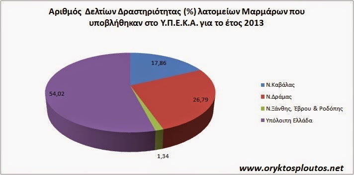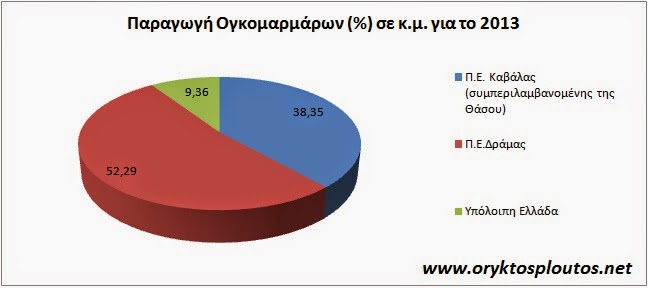 Επισημαίνεται, ότι το σύνολο της παραγωγής επαληθεύεται και από την ετήσια έκθεση του ΥΠΕΚΑ (Τζεφέρης 2012-2013) όπου καταγράφεται ετήσια παραγωγή ογκομαρμάρων για την Επικράτεια 220.000 κ.μ., δηλ. καταγράφεται μια μικρή απόκλιση από την ανωτέρω ετήσια έκθεση, που οφείλεται σε ορισμένα εκπρόσθεσμα δελτία δραστηριότητας.Η εξορυκτική/μεταλλουργική δραστηριότητα στην Ελλάδα. Στατιστικά δεδομζνα για τη διετία 2012-2013»Τα παραπάνω δεδομένα παρατίθενται και στο δεύτερο Διάγραμμα, από το οποίο προκύπτει, ότι το ποσοστό για την υπόλοιπη Ελλάδα, πέραν της Περιφέρειας Ανατολικής Μακεδονίας – Θράκης, ανέρχεται συγκεντρωτικά μόλις στο 9,36 %.
