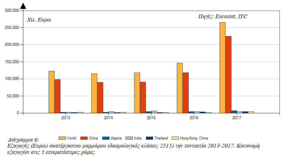 4. Τα λοιπά συναφή προϊόντα (γρανίτες, σχιστόλιθοι, ψαμμίτες και λοιπά διακοσμητικά πετρώματα) είχαν περιορισμένη παρουσία στις ελληνικές εξαγωγές. Για τα διακοσμητικά πετρώματα (πλην μαρμάρου) βλ. ενδεικτικό διάγραμμα 8.