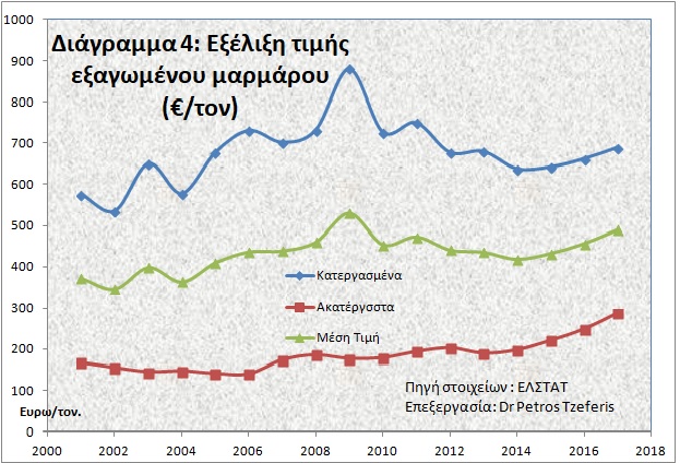 2. Η τιμή του μαρμάρου ανά τόνο αποτυπώνει τη διαφορά προστιθέμενης αξίας ανάμεσα σε ακατέργαστο και επεξεργασμένο προϊόν. Η τιμή ανά τόνο του επεξεργασμένου μαρμάρου από το 2001 έως και το 2014 κατά μέσο όρο ήταν τουλάχιστον τριπλάσια από του ακατέργαστου. Ωστόσο η μεταξύ τους διαφορά από το 2010 και μετά «ψαλιδίζεται» κάθε χρόνο ενώ είναι σημαντικό να αναφέρουμε ότι η τιμή ανά τόνο του ακατέργαστου μαρμάρου το 2017 αποτελεί ιστορικό υψηλό (διάγραμμα 4).